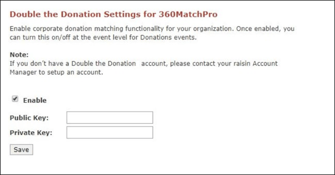 Scroll to the Double the Donation Matching section and check: Enable corporate donation matching