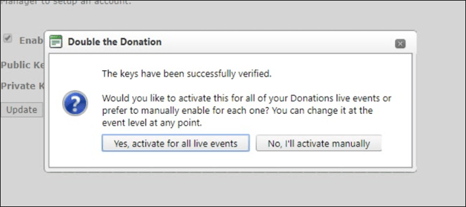 Activate for all live events → This automatically applies Double the Donation Matching to every current Donations module event.