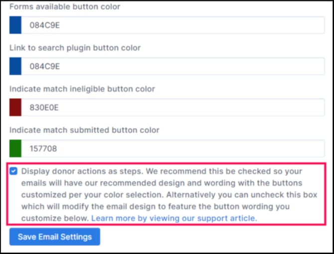 You can edit the wording of the link buttons by unchecking the box next to “Display donor action as steps,” which will modify the email design to feature wording you customize on the buttons rather than the default “Click here”.