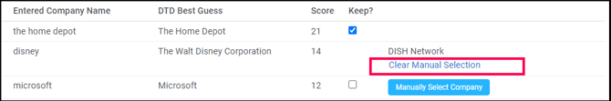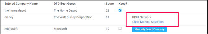- If the system cannot find a good match (e.g., displays "Reasonable best guess not found") or does not display the company you wish to map to that record, you can manually select the company.