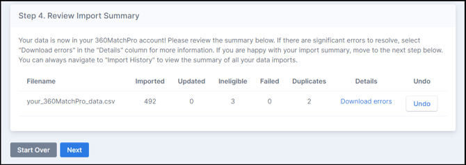 - Review the import summary, which details the number of records: Imported, Updated, Ineligible, Failed, and Duplicates.