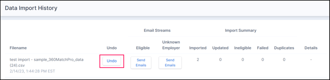 You can only undo a CSV Import BEFORE you send out automated matching gift emails. If you send out automated matching gift emails, you can't do so after completing that process.