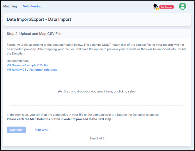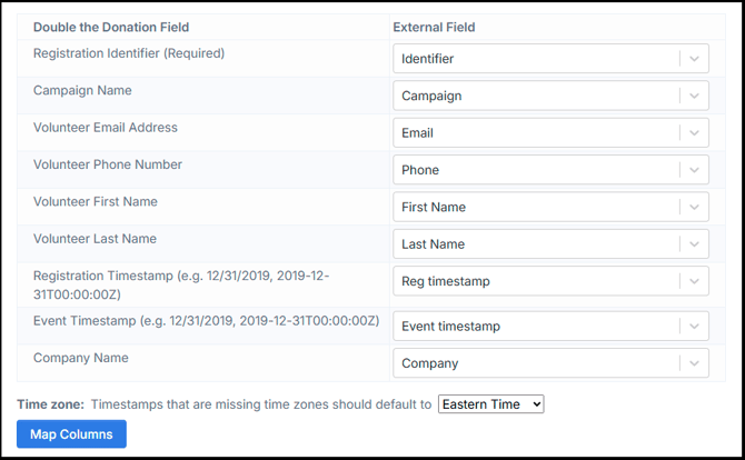 - In this step, you will upload your CSV file and map its fields to the fields in Double the Donation.