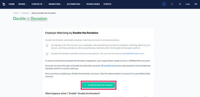 This article walks through Double the Donation's integration with BetterUnite.