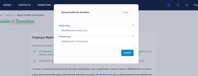Paste your Public API Key and Private API Key from Double the Donation Matching → Settings → API Keys, then click Submit.