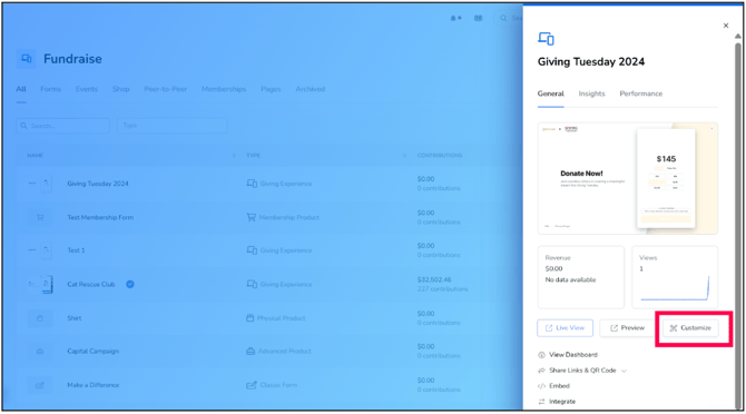 Step 1: Navigate to Fundraise and click on the Giving Experience donation form you want to integrate. Once there, click Customize.