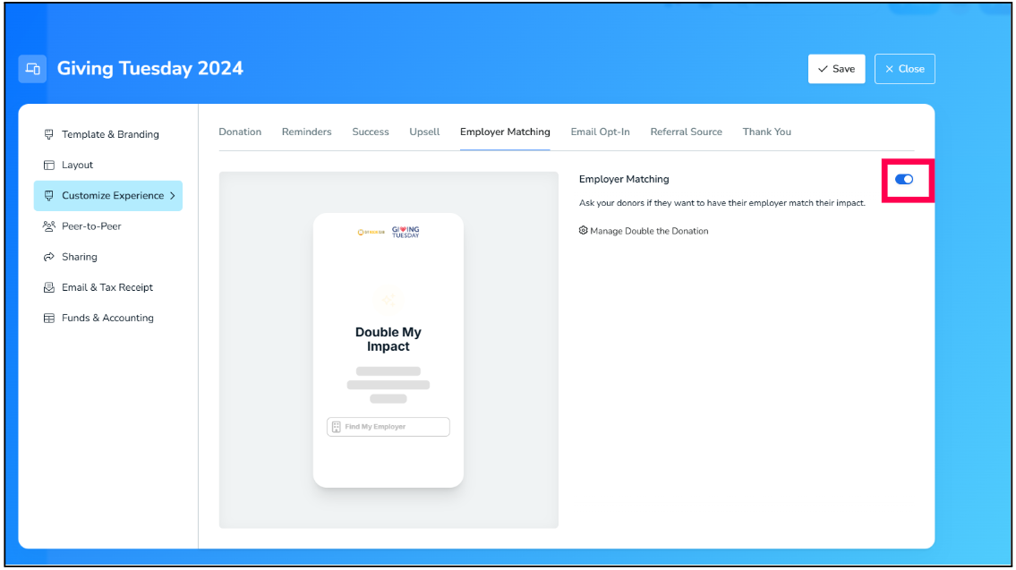 Step 4: Return to your donation form and ensure that Employer Matching is toggled On to integrate the form.
