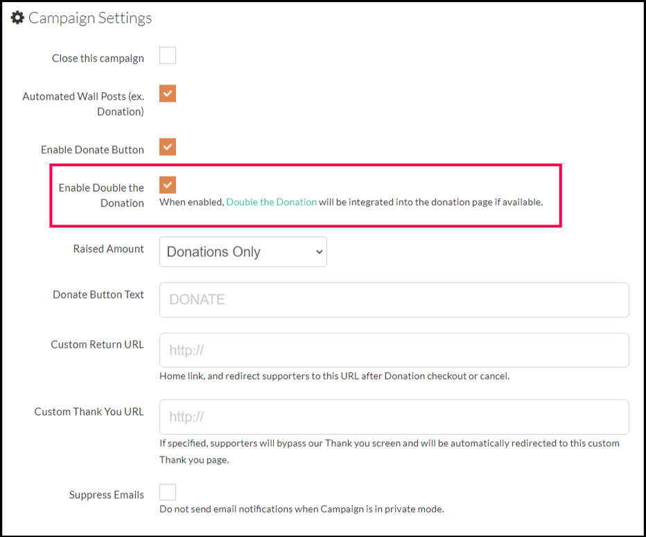 If your organization uses a custom Thank-You Page URL, you must: Add the Double the Donation Thank You Code found on the Giveffect integrations page.