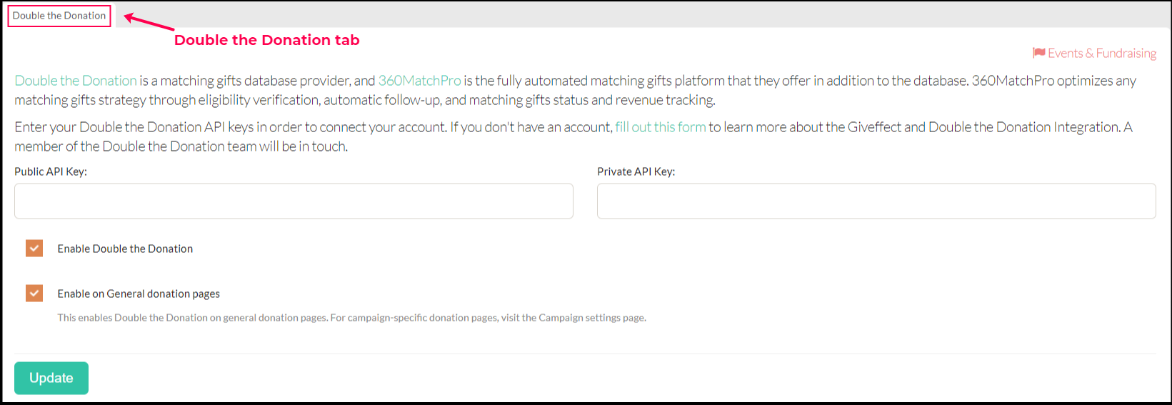 Enter your Public API Key and Private API Key from Double the Donation Matching.
