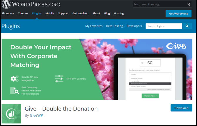 Navigate to Plugins, then search “Give – Double the Donation”,