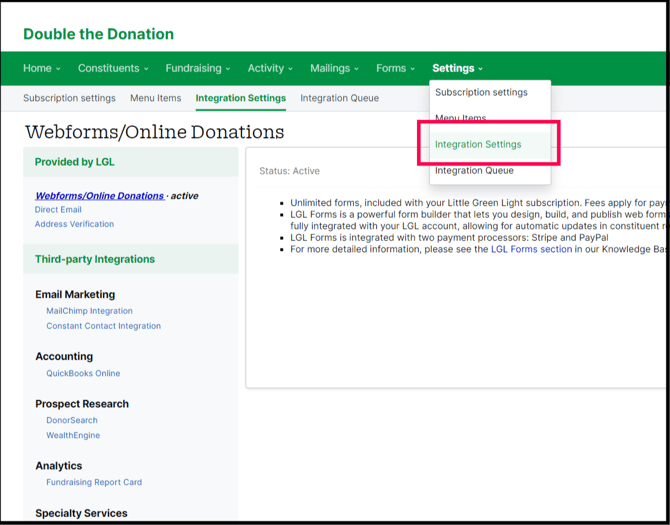 This section of the integration guide is intended to help organizations establish a direct link between Double the Donation Matching and Little Green Light CRM. Once a direct link is established, donation records from your Little Green Light CRM will automatically flow into Double the Donation on a nightly basis. In the matching module, donations will enter automated email streams to drive the employer matching process to completion. Read on to section 2 to discover how to add Double the Donation to your Little Green Light Donation Forms.
