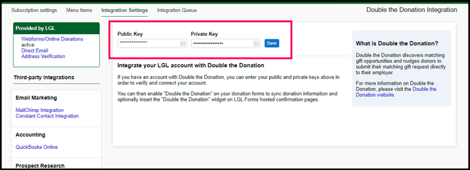 Paste your Double the Donation Public and Private API Keys and click Save.