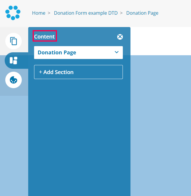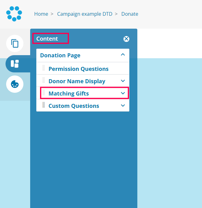 5. Next open the Content menu option and expand Donation page