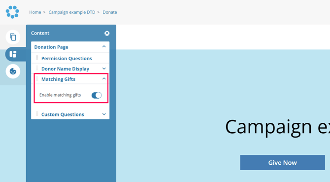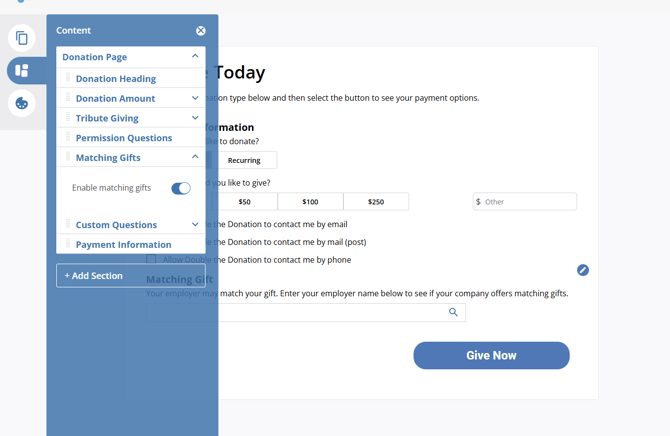 5. Expand Donation Page, and you will see a section labeled Matching Gifts. Enable Matching Gifts. Save your changes.