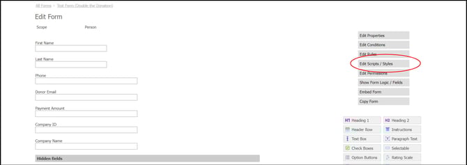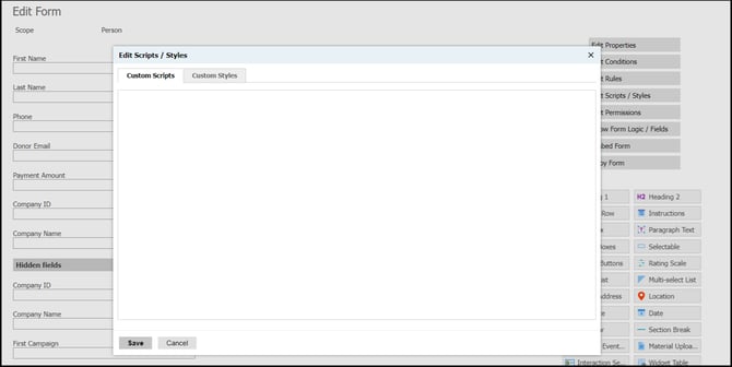Click Edit Scripts/Styles from the menu on the right side of the form builder.