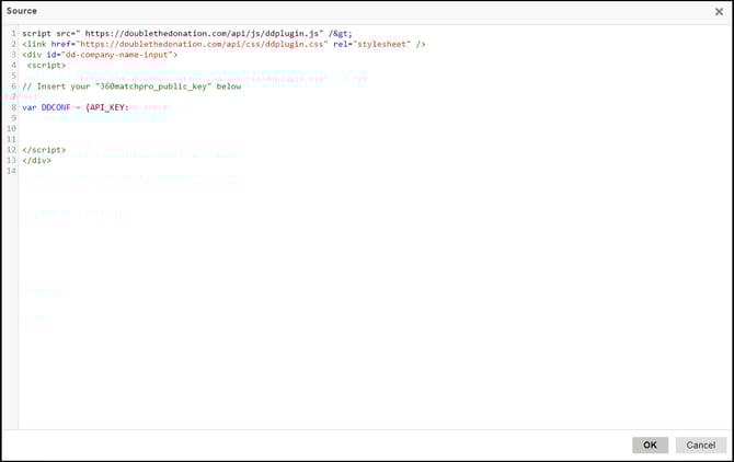 Be sure to replace YOUR_DOUBLETHEDONATION_PUBLIC_KEY with the public key provided to you by Double the Donation, ensuring it is between the quotation marks.