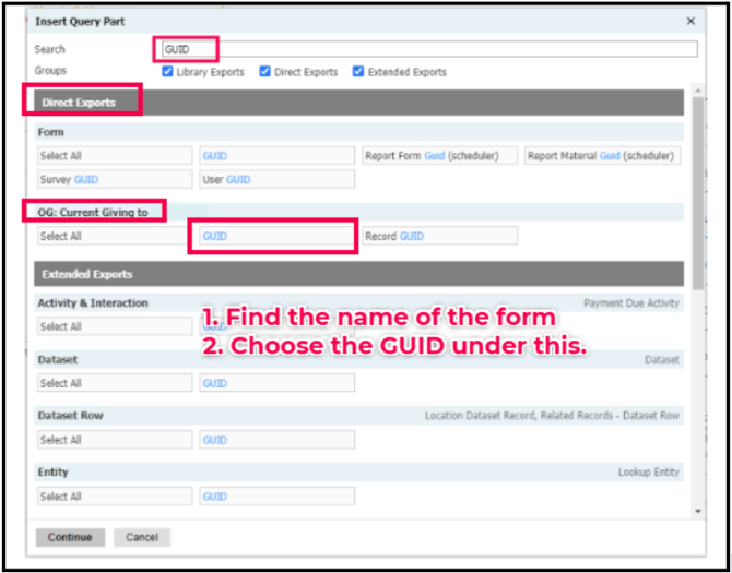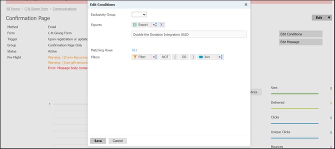 In the Direct Exports section, select the Form Response GUID export for the online giving form you are integrating with Double the Donation Matching and click Continue to return to the Edit Conditions popup.