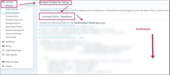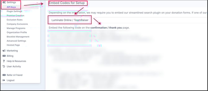 In Double the Donation, go to Settings → API Keys → Embed Codes for Setup.