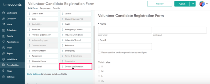 - The new Double the Donation field now appears in your Database Fields list and can be added to any Timecounts form.