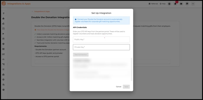 Step #2: Insert your public and private API Keys from your Double the Donation account. Click Save.