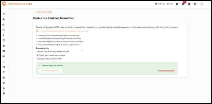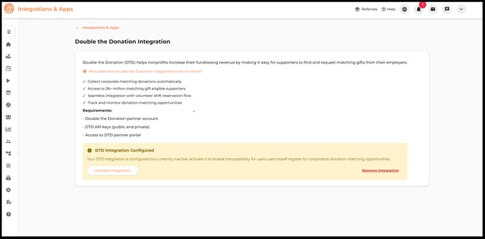 Double the Donation Volunteering is the industry-leading workplace giving automation solution for nonprofits and educational institutions to identify more volunteer grant and volunteer time off opportunities and drive more submissions to completion. You’ll need access to the Double the Donation Volunteering module to activate the volunteer incentive functionality within this partner platform.