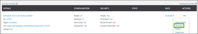 Locate a web form using Quick Filters or Advanced Filter, then hover over Actions and select Manage.