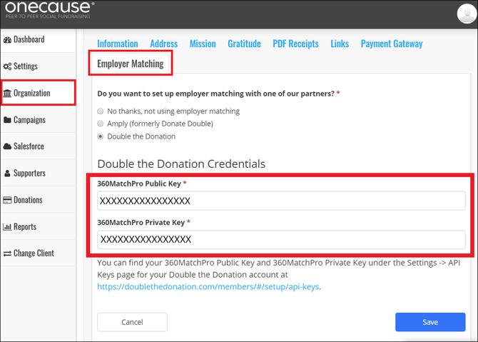A: Login to your Double the Donation Matching portal at https://doublethedonation.com/members/login/. Navigate to "Settings" and then "API Keys." You will enter your public and private API keys into OneCause, as illustrated in Step #2.