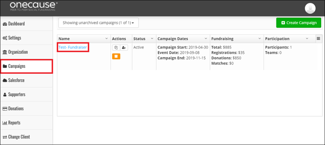 Select the fundraising campaign where you want matching gifts enabled.