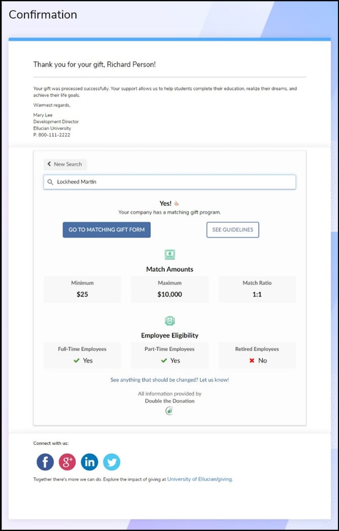 A: We recommend creating a dedicated matching gift page on your website. This page will help all website visitors, not just those on your donation form, understand matching gift programs and easily find their company’s matching gift guidelines and forms.