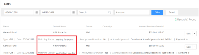 Some matching gift data is also viewable directly within your NonProfitEasy CRM.