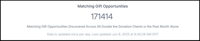 At the top of your dashboard, you’ll find a summary of high-level statistics offering a quick snapshot of matching gift activity. These figures represent aggregate data from all Double the Donation clients and are updated once daily.