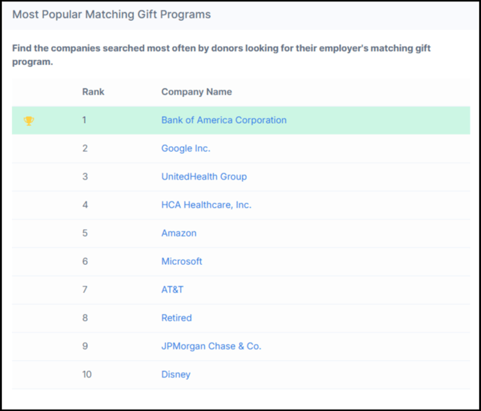 This section highlights the companies most frequently searched by donors looking for their employer's matching gift program.