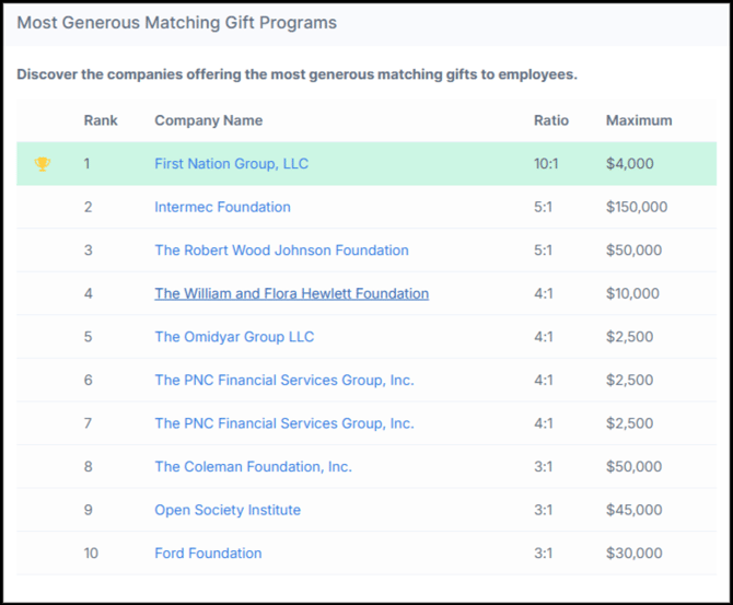 Purpose: Helps your organization identify the biggest matching gift opportunities and which companies are leaders in workplace philanthropy.