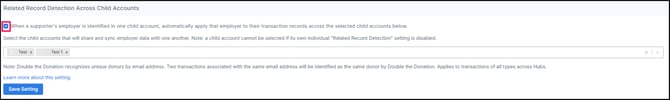 When enabled, if a supporter’s employer is identified in one child account, Double the Donation will automatically apply that employer to that same donor’s transaction records across all other selected child accounts.