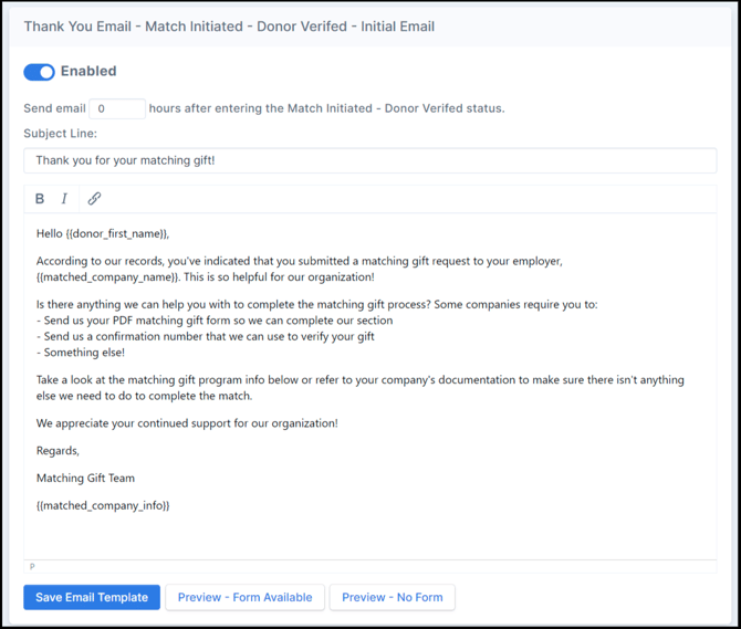 Number of Emails: Up to 4 emails can be sent, each based on a different advanced status in Double the Donation Matching.
