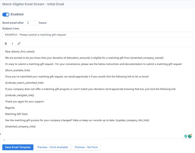 Sending Time: Edit the time delay for when the emails are sent after the donation record enters the Double the Donation Matching system.