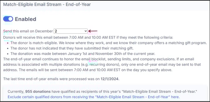 This stream is your organization's end-of-year reminder to donors to submit their matching gift requests during the month of December.