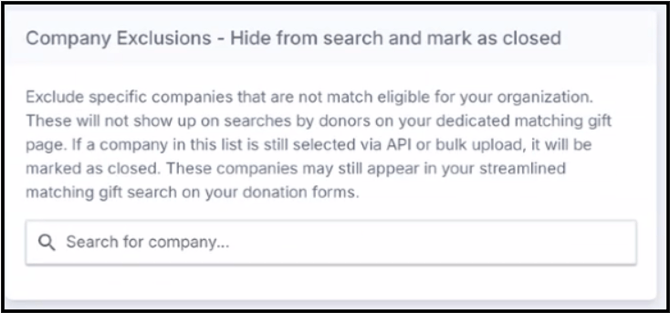 This setting allows you to prevent specific companies from appearing on your dedicated matching gift page search tool.