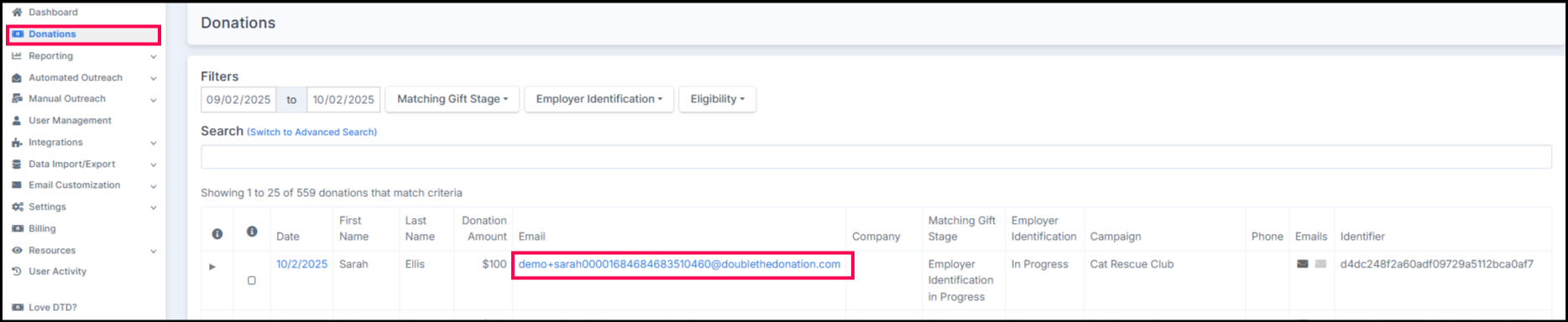 Example: A donor self-identifies in a matching gift email as ineligible.