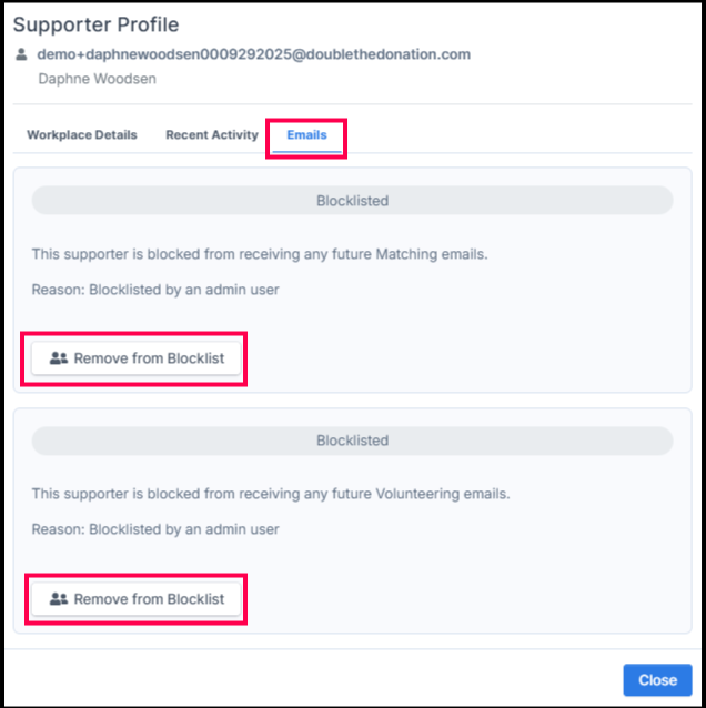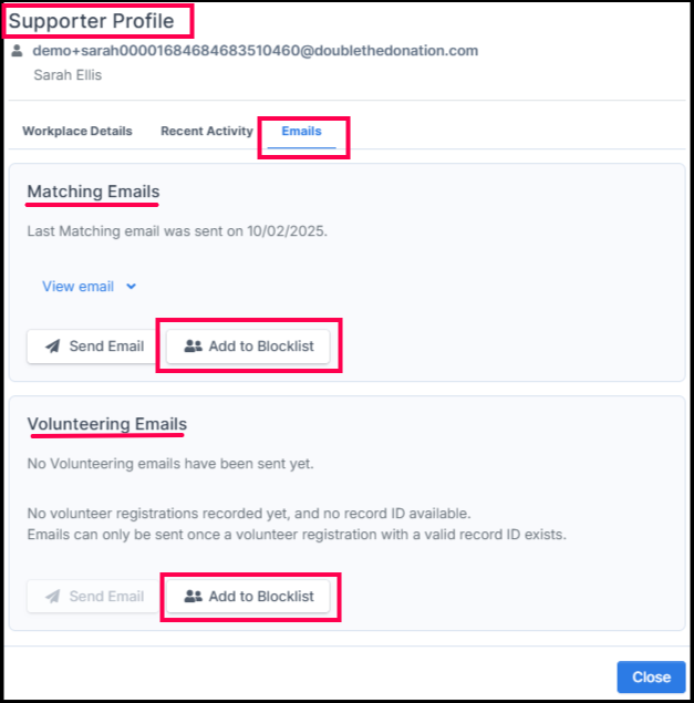 A Supporter Profile window will appear with an Emails section. From there, you can either Add to Blocklist or Remove from Blocklist.