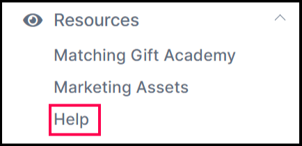 The Help section within your account is located under the Resources tab in the navigation menu. This section offers various resources to help your organization maximize the use of Double the Donation Matching and its features.