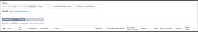 The Registrations Table displays all volunteer registration records that flow into your Double the Donation account. This table includes key details about each volunteer’s registration and helps your organization track volunteer participation and identify opportunities for corporate volunteer grants or other workplace giving programs.