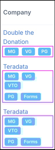 Additionally, in the Company Name column, available workplace giving programs are represented by tags: