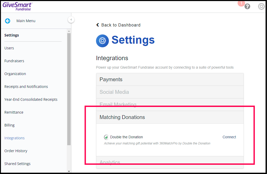 Log in to your GiveSmart Fundraise dashboard, open the left-hand menu, and click: Settings → Integrations