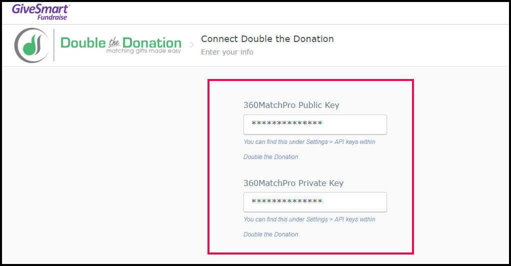 These can be found in your Double the Donation Matching portal under Settings → API Keys.