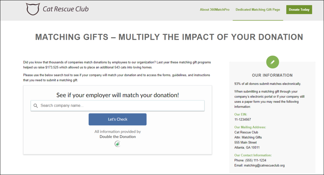 If a donor interacts with the matching gift search field on a donation form, Double the Donation can identify the company and associate it with the donation. This feature makes it easy for donors to find their employer's matching gift program. Click here to learn more about the online donation forms we integrate with.