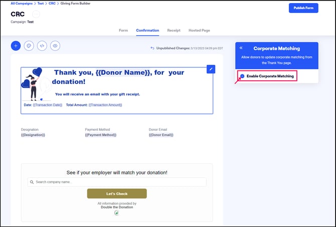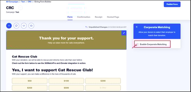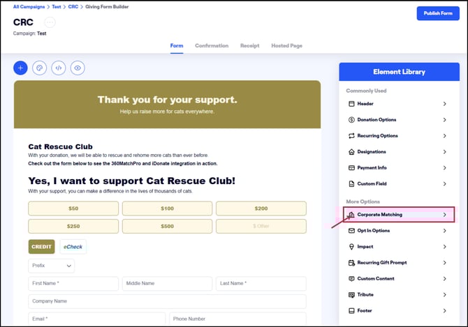 Step 3 — Add the Matching Gift Search Tool to the Donation Form