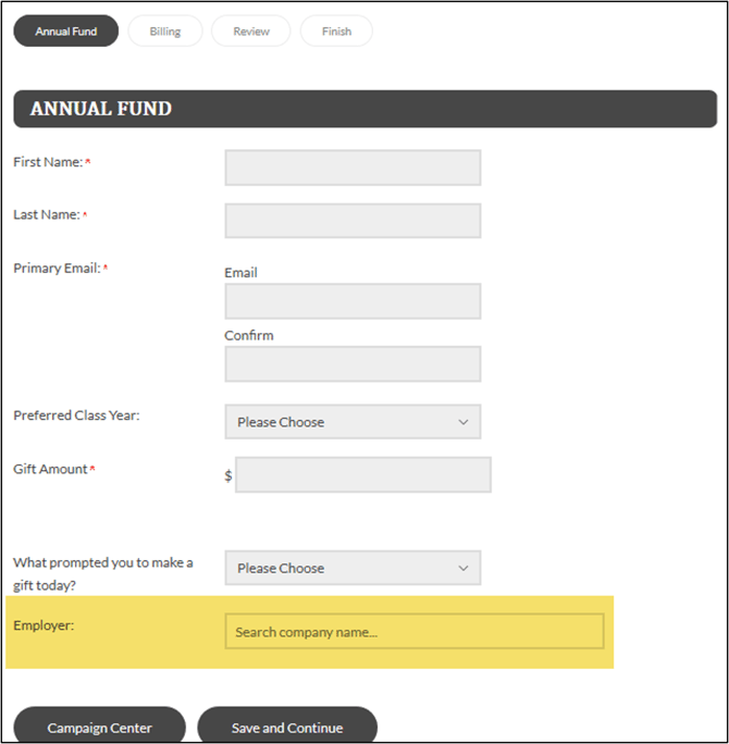 Why? This immediately visible configuration ensures that every donor has the best chance of seeing and interacting with the employer name search field. Requiring donors to take an additional action like expanding a new section adds friction to your form, lowering your matching gift identification rates as well as the overall conversion rate of your form.