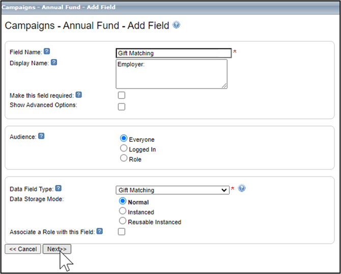 From the Data Field Type dropdown, choose Gift Matching under Campaign Fields.