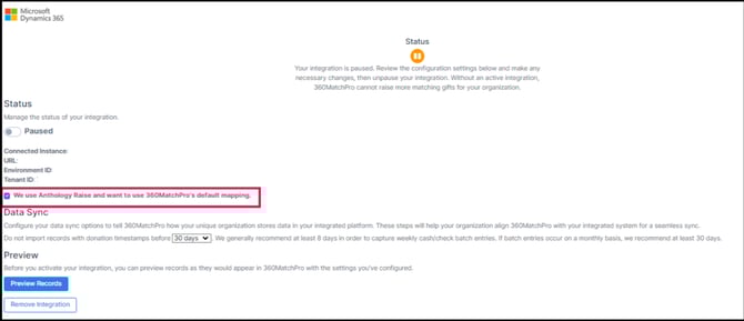 A: Yes, if you want to customize the integration to meet your unique data needs and storage, simply uncheck the “We use Anthology Raise and want to use Double the Donation Matching's default mapping” box. From there, you can customize your mapping based on the specific Raise/Microsoft Dynamics 365 fields and tables you use. We recommend checking out our Microsoft Dynamics 365 integration guide for more details.